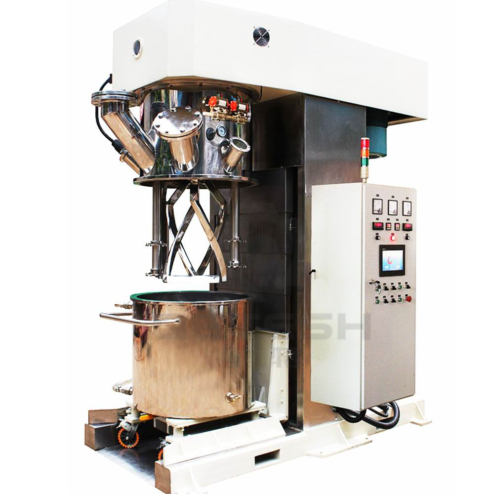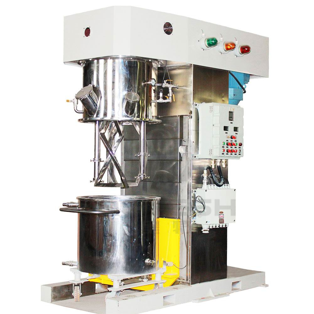雙行星動力混合機是一種新型且對多種混合液體、粉體進行攪拌、溶解、分散、均質(zhì)效率好的攪拌設(shè)備。該設(shè)備配有高速、低速、活動刮板部件,低速攪拌部件采用行星齒輪傳動,攪拌槳在公轉(zhuǎn)時也自轉(zhuǎn),使物料上下及四周運動,從而在較短的時間內(nèi)達到理想的混合效果。高速分散/乳化部件與行星箱一起公轉(zhuǎn),同時高速自轉(zhuǎn),使物料受到強烈的剪切與分散混合,罐體內(nèi)壁為大型立車精加工,再經(jīng)大型拋光機自動拋光,確保行星箱上的活動刮刀在旋轉(zhuǎn)時,把罐體內(nèi)壁上的物料完全刮掉,其混合效果是普通混合機的幾到幾十倍。多應(yīng)用于電池、有機硅膠、好油墨、染料、粘膠劑、高粘度涂料等化工產(chǎn)品的生產(chǎn)。